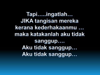 Rasakanlah karunia waktu yang masih diberikan. Tentu kata ibu Hanya anak yang sholeh Penyejuk hati ayah dan ibu Taatlah kepada Allah Amalkan segala hukum perintah-Nya Jaga hubungan sesama kita Berakhlak mulia di mana jua Taat pada ayah ibu Jagalah hatinya Hiburkanlah mereka Ingatlah susah payahnya Balas semua jasa mereka Redha Allah Redha ayah ibu Kebahagiaan dunia akhirat. Sebagai balasan ibumu melahirkan.